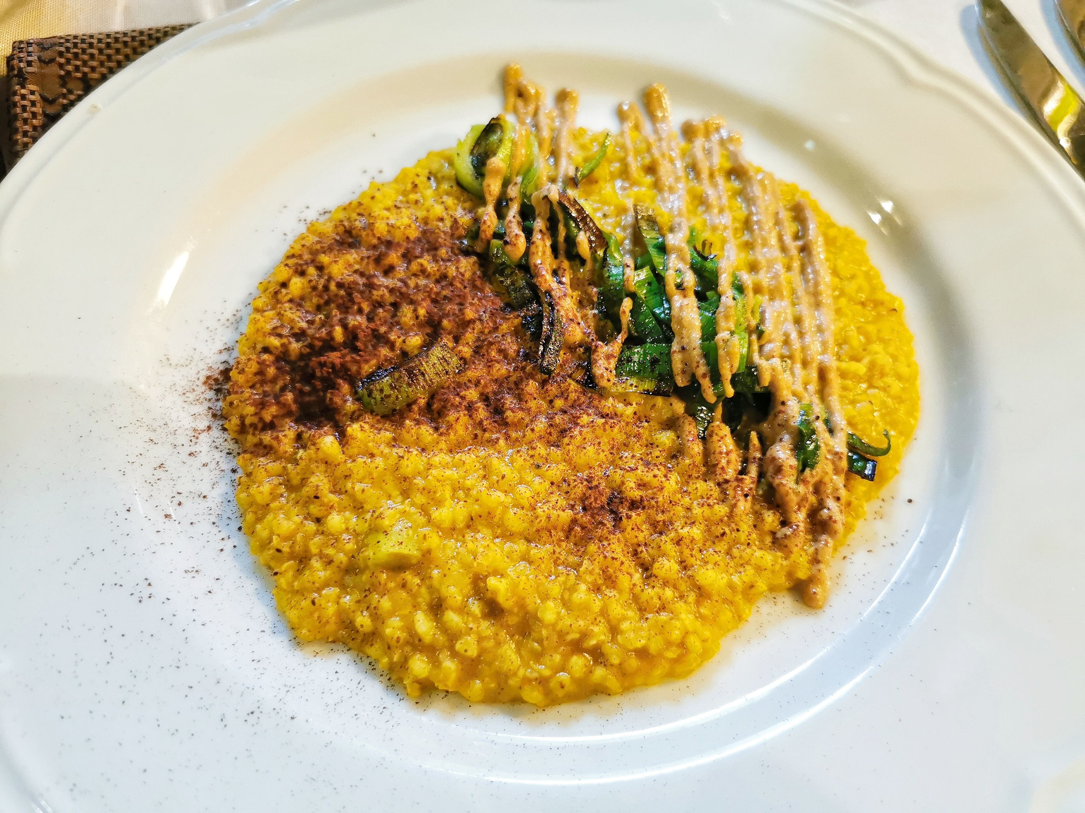 Peneče vino? Nekaj možnosti je in vse so na voljo na kozarec: od Silverija do Bretza in Kralja. Kar hišno bomo. Gre za Isteničeve rožnate mehurčke, ki jih po navodilih Ruja pridelajo bolj suhe. Sijajen uvod v degustacijo šestih jedi, ki brez vina stane za te čase znosnih 53 evrov. Ob vodi (cana ali radenska) so na mizi domači grisini in dve vrsti kruha (beli in ajdov z orehi), olje je Rodičin Sveti Kancijan, pozdrav iz kuhinje pa sodobna priredba tradicionalne kraške oziroma tržaške ocvrte polpete, tokrat iz korenja in krompirja ter podložena z začinjenim jogurtom.