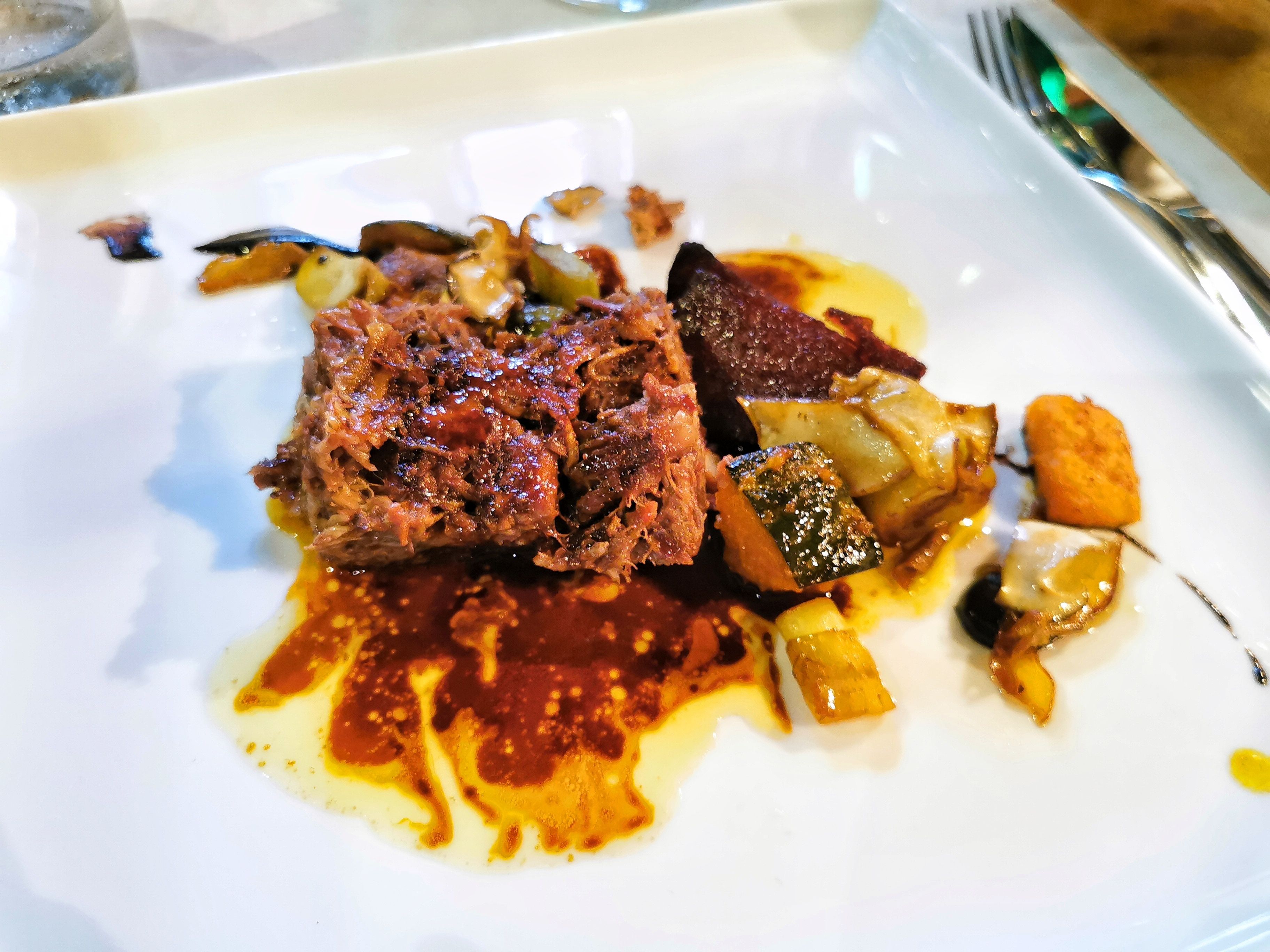 Konkretno vino je v finalu pokrilo mesnine, na eni strani počasi pečen goveji rep, na drugi prav tako zmehčano kozličkovo potrebušino. Kljub ne ravno razkošnim delom mesa je mojster s pripravo in prilogami znal ustvariti privid velike kuhinje, prvo meso je spremljala omaka iz ribeza, drugo omaka iz suhih sliv, obe vrsti pa sta za priloge dobili pečeno bučo, por, rdečo peso in gobe.