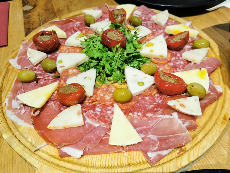 Res škoda, da mladih natakarjev nihče ni poučil, kaj vse je na krožnikih, je pa vse iz trgovine, so bili prepričani. Približno smo uganili, da je pred nami pršut San Daniele, ob pikantni klobasi in salami pa so sodelovali olive, paprike, polnjene s tuno, kaprami in pistacijo, ter trije siri: klasičen poltrdi, rahlo pekoč s papriko in sir s pistacijo. Solidno. Na žalost je bilo največ rukole, ki je podložena skrbela predvsem za volumen jedi, ki stane 17 evrov.