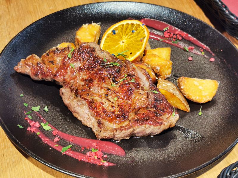 Pojdimo k mesu, ki je trgovino Cool House proslavilo. Kar na 34 evrov cenijo dokaj tanko odrezan rib-eye ameriškega black angusa. Je pa treba reči, da je bil pečen, kot se spodobi, mehak in okusen, simpatičen je bil tudi priložen pečen krompir s parmezanovo skorjico.