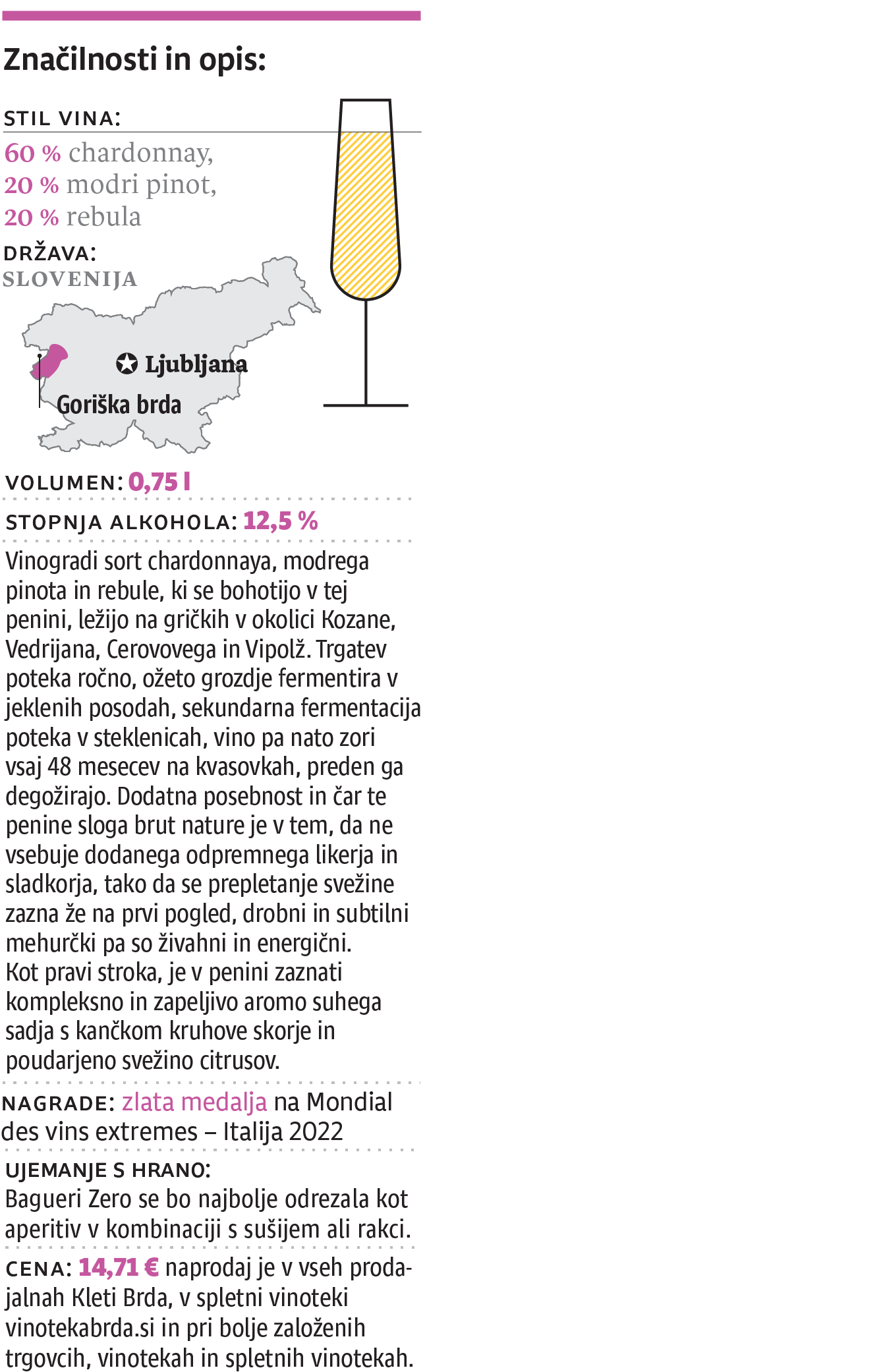 Bagueri zero iz kleti Brda je penina brez dodanega odpremnega likerja in velja za eno najbolj dovršenih pri nas.