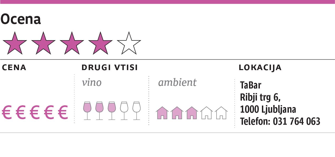 Za 65 evrov boste dobili šest jedi, devet hodov vas bo stalo 90 evrov. Naša ad hoc zbrana ekipa se je odločila za krajšo verzijo in treba je reči, da se niti približno nismo najedli. Lahko bi celo rekli, da je TaBar bolj kot gostilna nekakšen hibrid pokuševalnice in likovne delavnice ter s tem verjetno najbolj eksperimentalna kuhinja v Ljubljani, če ne kar v Sloveniji. Po drugi strani pa interjer lokala, ki se od odprtja ni kaj veliko spremenil, ne spremlja kuhinje in bolj spominja na interjer kakšnega vinskega bara, ki ob pijači ponudi še kak prigrizek.