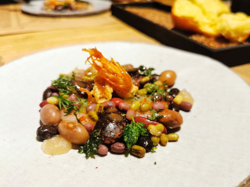Nekoliko večja je bila naslednja jed, variacija fižolov – našteli smo sedem različnih vrst, med njimi je bil tudi orjaški keber, osmo vrsto je predstavljala fižolova voda, deveto pa fižolov pire. Med fižolom, ki je bil sam po sebi nekoliko presuh, so bili kozice, kivi in pomarančna omaka.
