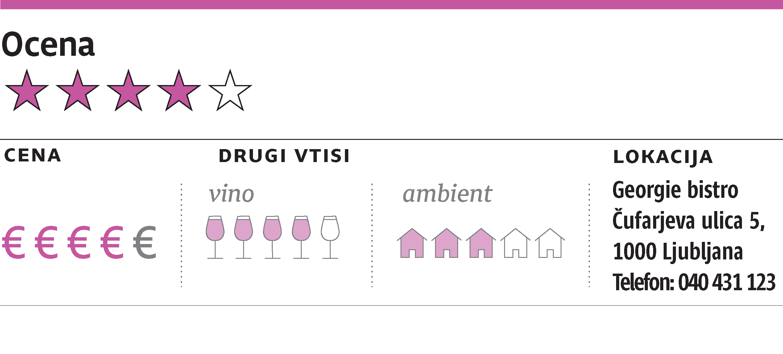 Zdi se, da se bo Georgie sproti še preoblikoval, da še niso povsem zaključili prilagajanja prostora na Čufarjevi. A so velika jedilnica, prijetna postojanka in novo moštvo s svojimi ne zgolj avtorskimi, ampak tudi konkretnejšimi jedmi že privabili publiko. Po nekaj obiskih namreč že lahko ugotovimo, da pri Georgieju v skoraj povsem odprti kuhinji ne mrcvarijo sestavin in lahko ob jedeh ponudijo tudi enostavnejša ali klasična vina, ne zgolj oranžnih, biodinamičnih, naravnih in nadnaravnih, kot je v modernih restavracijah ponekod še vedno v navadi.