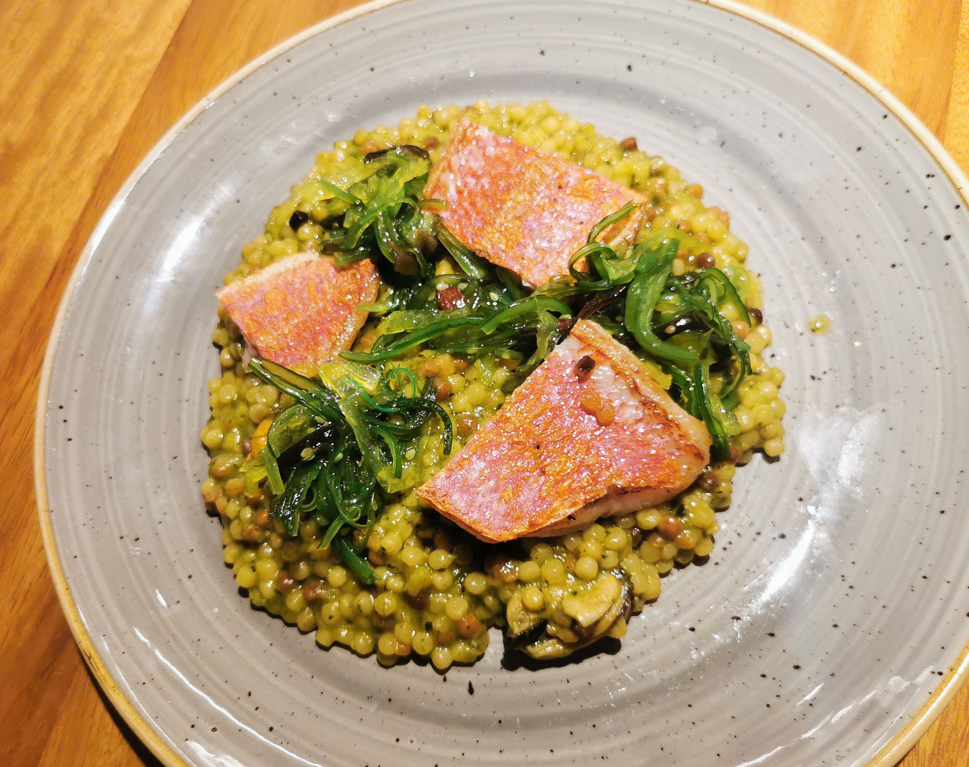 Lahko pa je tudi lep kos dišeče govedine, natančno pečenega striploina, ki mu ob ohrovtu in pečeni čebuli dodajo konkretno zajemalko krompirjevega pireja, da ne bo kdo ostal lačen. Seveda ne bo. Konec koncev je tudi fregola s špinačo, blitvo, dagnjami, algami wakame in filejem trilje na vrhu že kar nasitna jed.
