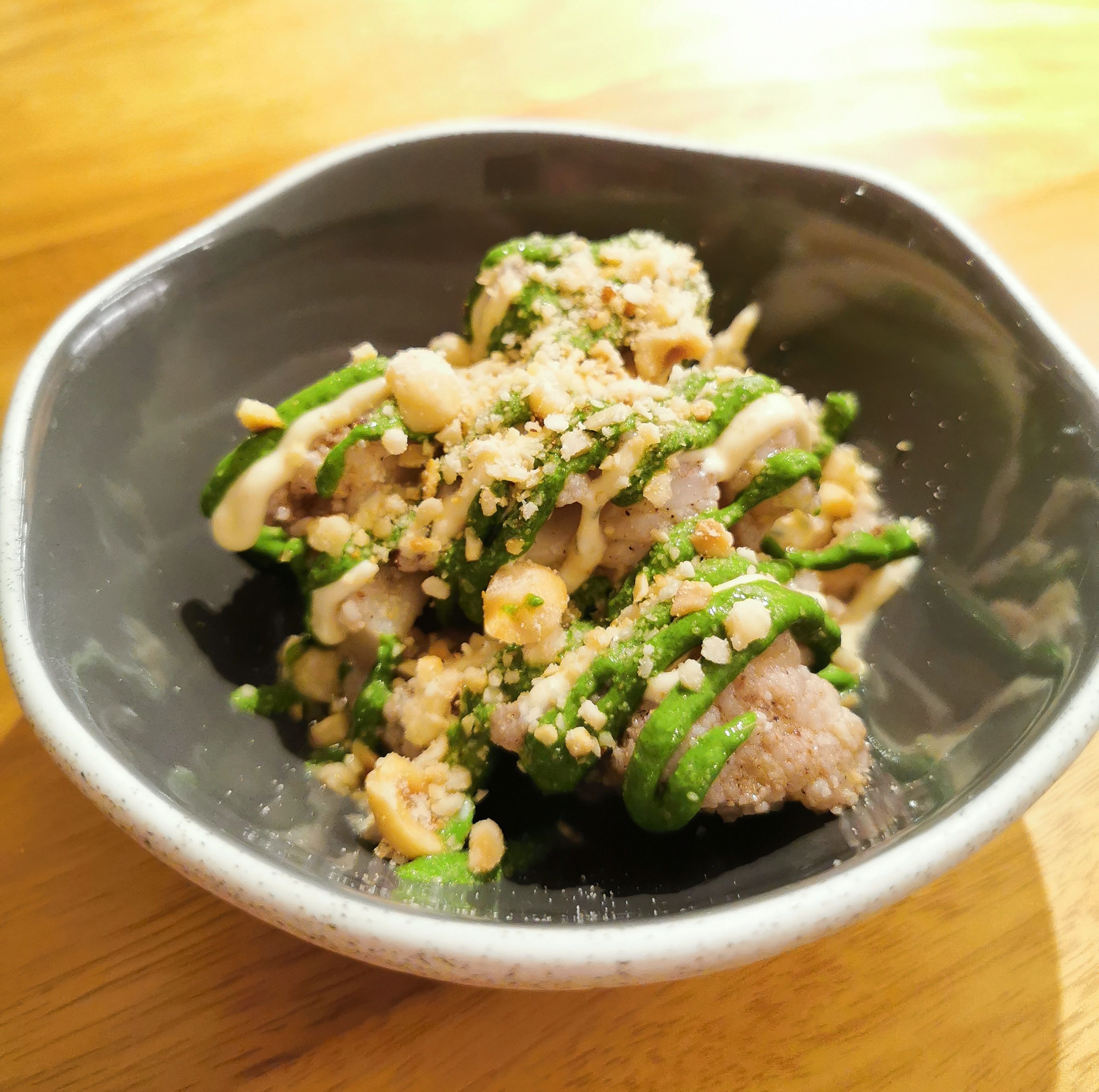Ob Kozincu so pozdravili z žepno fokačo z miso majonezo, olupkom pastinaka in kapucinko. Nič posebnega, bi lahko rekli, toda okusi so bili povezani in grižljaj je napovedoval lep večer: pečeno polenovko z jabolkom, mandlji, kremo iz rdečega zelja, algami wakame in bearnsko omako (14 evrov). Dva evra cenejši je tatarski iz zorjene postrvi z rdečo redkvico, riževim čipsom, omako iz fermentirane limone in ikrami postrvi.