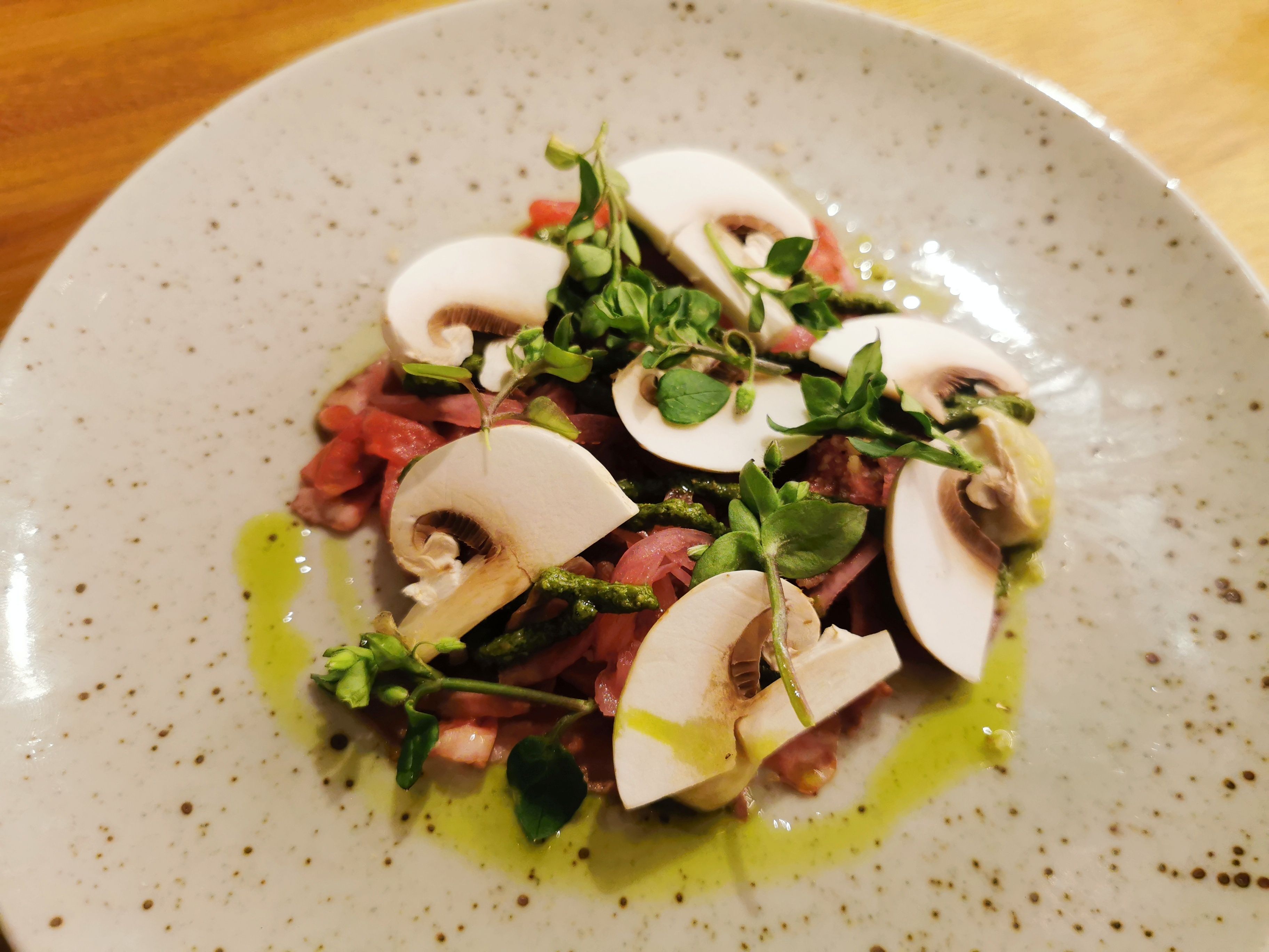 Jedi niso majhne, še večje so za kosilo, ko (samo) opoldne pripravijo trihodni meni za zmernih 26 evrov. Mi pa smo za začetek naše večerje med predjedmi preprosto morali pokusiti še hladen rostbif s svežimi šampinjoni, kurjimi črevci (gre seveda za okusen plevel) in zeliščnim oljem. Lep uvodni krožnik za zmernih osem evrov.