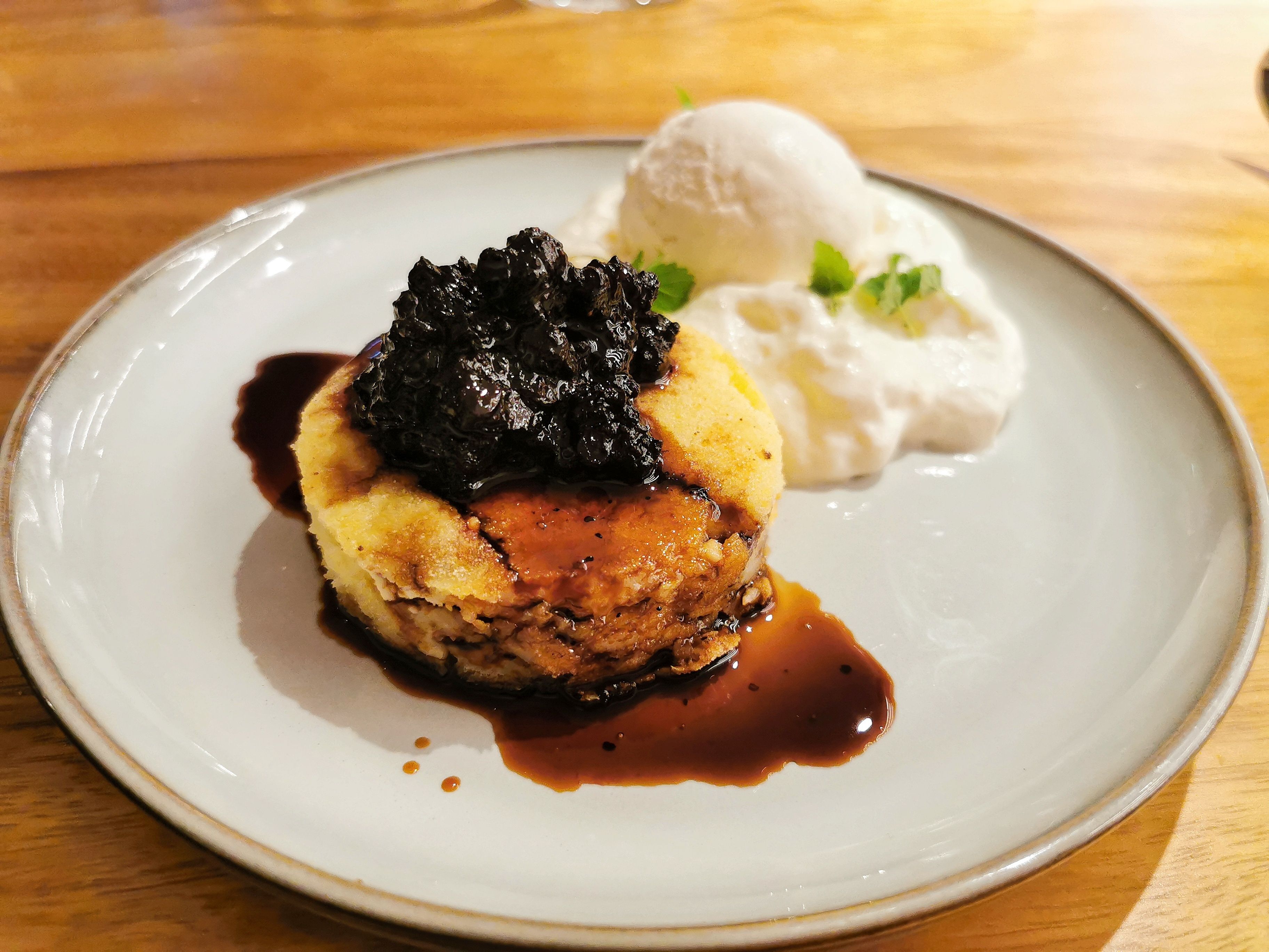 Iaquinovi rdeči zvrsti, ki se je povsem zlila z okolico, tako s svinjino kot govedino in ribo, je sledilo slavno štajersko sladko vino Fuga Mundi, ki je napovedalo sladice. Denimo omleti podobno palačinko z borovničevo marmelado, peno iz marcipana in sladoledom earl greya. Na drugi strani je bila avtorsko predelana granita mete, na tretji pa datljev kolač s skutnim sladoledom in arašidovo kremo.