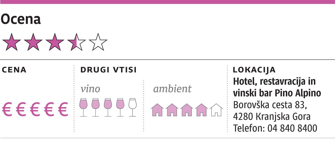 Naj dodamo, da imajo v Pinu Alpinu zakladnico žganih pijač. Dobiti je vse od smrekovca do ruma in nazaj. Malce nas je presenetilo, da imajo tudi viljamovko znamke Berke z Goričkega, solidno, a za naše razmere drago kapljico (šilce je devet evrov) za lažjo pot domov iz restavracije, ki ji morda manjka ščepec domačnosti.