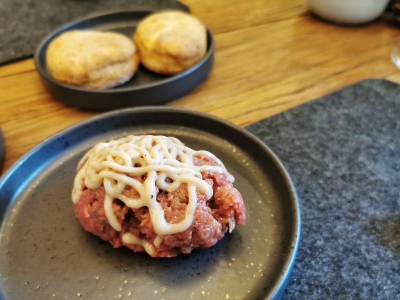Tudi pozdravčkov ali vsaj pozdravčka iz kuhinje ni, kar je ob degustacijski naravnanosti pravzaprav presenečenje, so pa zato postregli res veliko in ne predrago porcijo solidne piščančje paštete z mandljevim prelivom in parmezanom. Lotili smo se tudi nekaj manjšega, na roke strganega tatarskega bifteka. Meso je začinjeno minimalistično, dodajo mu preliv iz kostnega mozga (16 evrov) in priložijo izvrstne tople hlebčke s parmezanom. Če potrebujete več, so na mizi še tri vrste kruha, beli, polnozrnati in z orehi. Če bi piknili še kaj hladnega, imajo narezka mesnin in sirov, mi pa smo šli že v toplo smer in se lotili juhe. Tisti dan so skuhali le govejo (5,5 evra), ki je bila po okusu nekam bleda, po fritatih pa rahlo revna.