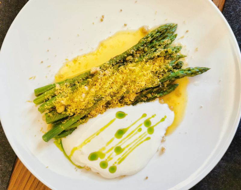Šparglji z dehidriranim rumenjakom, peno parmezana in pinjolami