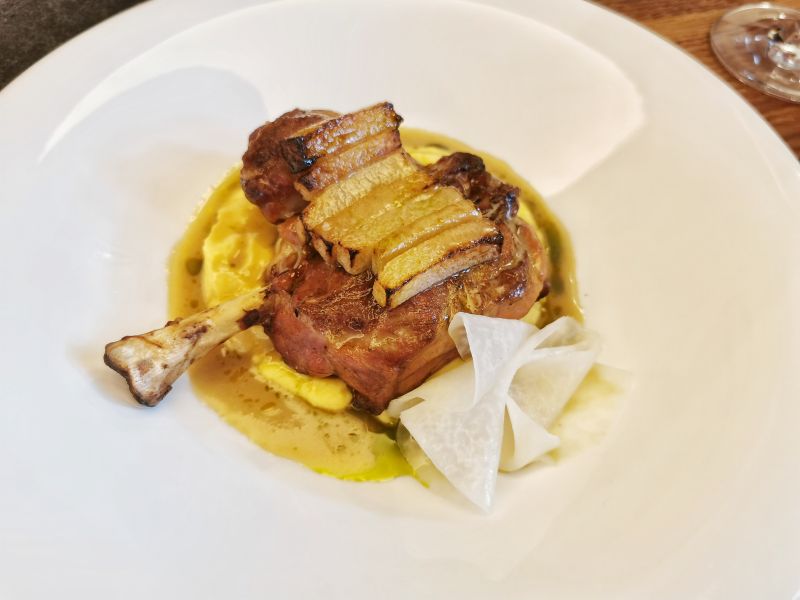 Na jedilniku je šest glavnih jedi, a se goveji file po slovensko dvigne na visokih 32 evrov, ena od jedi je poboljšana solata s sadjem in sirom, ličk za 26 evrov ne bi jedli ... Na koncu smo ob modrih pinotih jedli majhno razkoščičeno piščančje bedro (19 evrov) s pirejem iz jajčevcev, češnjevim paradižnikom in majonezo s pinjolami ter, na drugi strani, večjo pečeno svinjsko kračo (25 evrov) s kolerabinim pirejem, kuhano in fermentirano kolerabo ter masleno omako. Morda ni pravi trenutek, a vseeno je treba reči, da v zadnjem času pri glavnih jedeh dobimo vse več pireja oziroma različnih pirejev, ki delujejo kot mašilo ali, še huje, nadomestek kakovostnih sestavin. Zdi se, da se nam je to vsaj malo zgodilo tudi v Kranjski Gori.