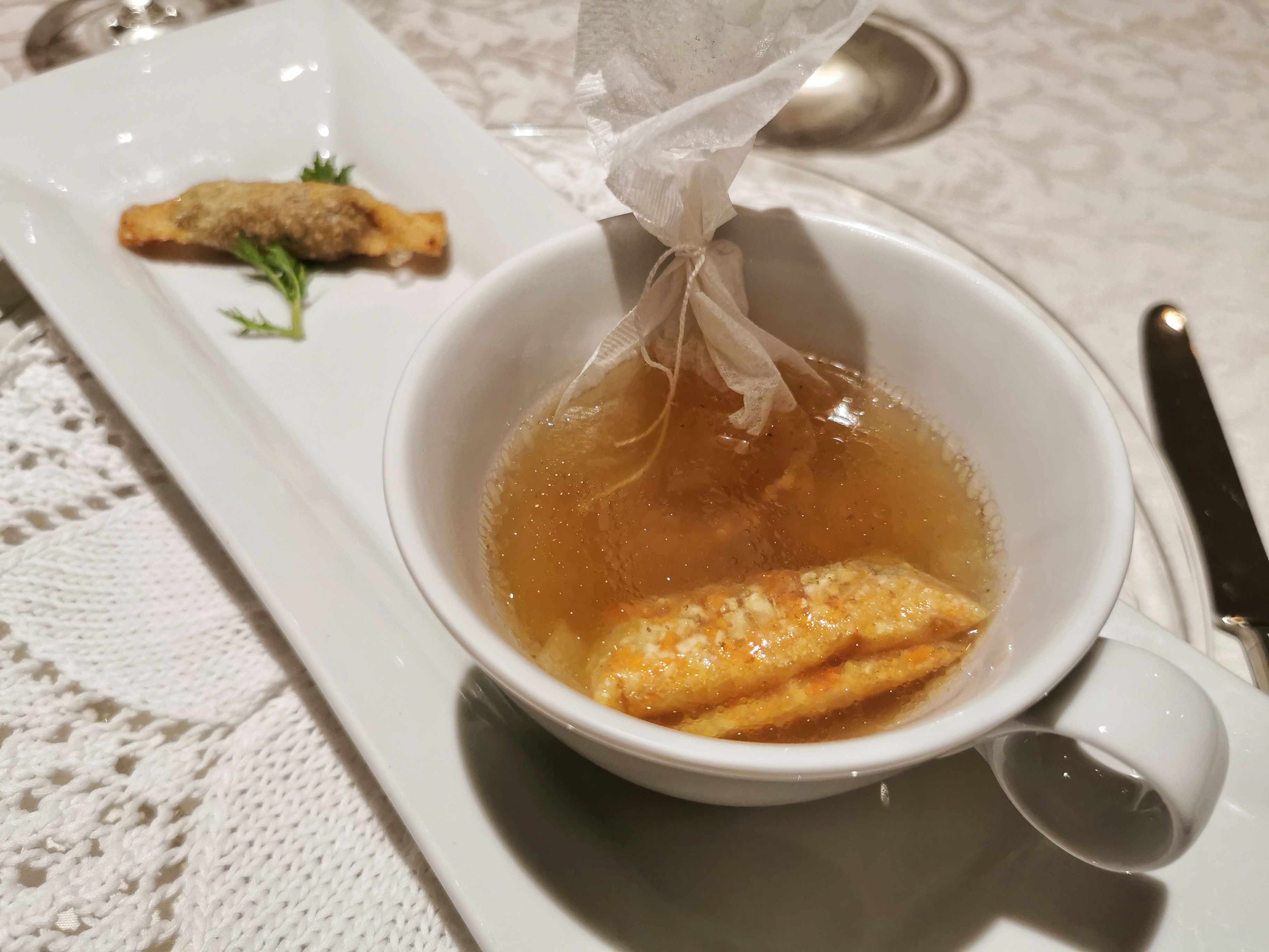 A pojdimo najprej h goveji juhi oziroma receptu, ki se duhovito poigra s klasičnim. Juho nalijejo v skodelico in vanjo potopijo sušeno jušno zelenjavo v čajni vrečki, z govedino iz juhe pa napolnijo ocvrtek, ki ga grizljate, medtem ko srkate dišečo tekočino, eno najboljših govejih juh, kar smo jih pokusili v zadnjem času.