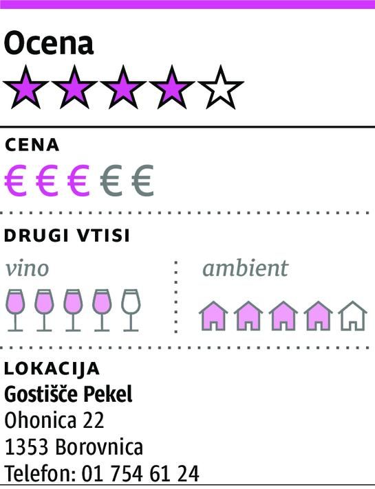 Gostišče Pekel, kakšna dva kilometra od Borovnice, sicer velja za lokacijo, kjer se spodobi jesti postrvi, a so že nekaj let med vinsko publiko znani tudi po vinih iz priljubljene čilske kleti Concha y Toro. Cene so ugodne, začnejo se pri dveh evrih za kozarec, lahko pa dobite tudi najprestižnejšo rdečo kapljico za 140 evrov. Za vsak slučaj je v hladilniku tudi šampanjec Mumm za več kot ugodnih 44 evrov, jasno, v ponudbi pa je najti tudi nekaj enostavnejših in cenejših slovenskih vin za kakšna dva evra na kozarec. Pa tudi drugače so cene ob poteh, kjer vsako noč hlačajo medvedi, zelo znosne in vsaj za vsega hudega vajene ljubljanske jedce pravzaprav poceni.