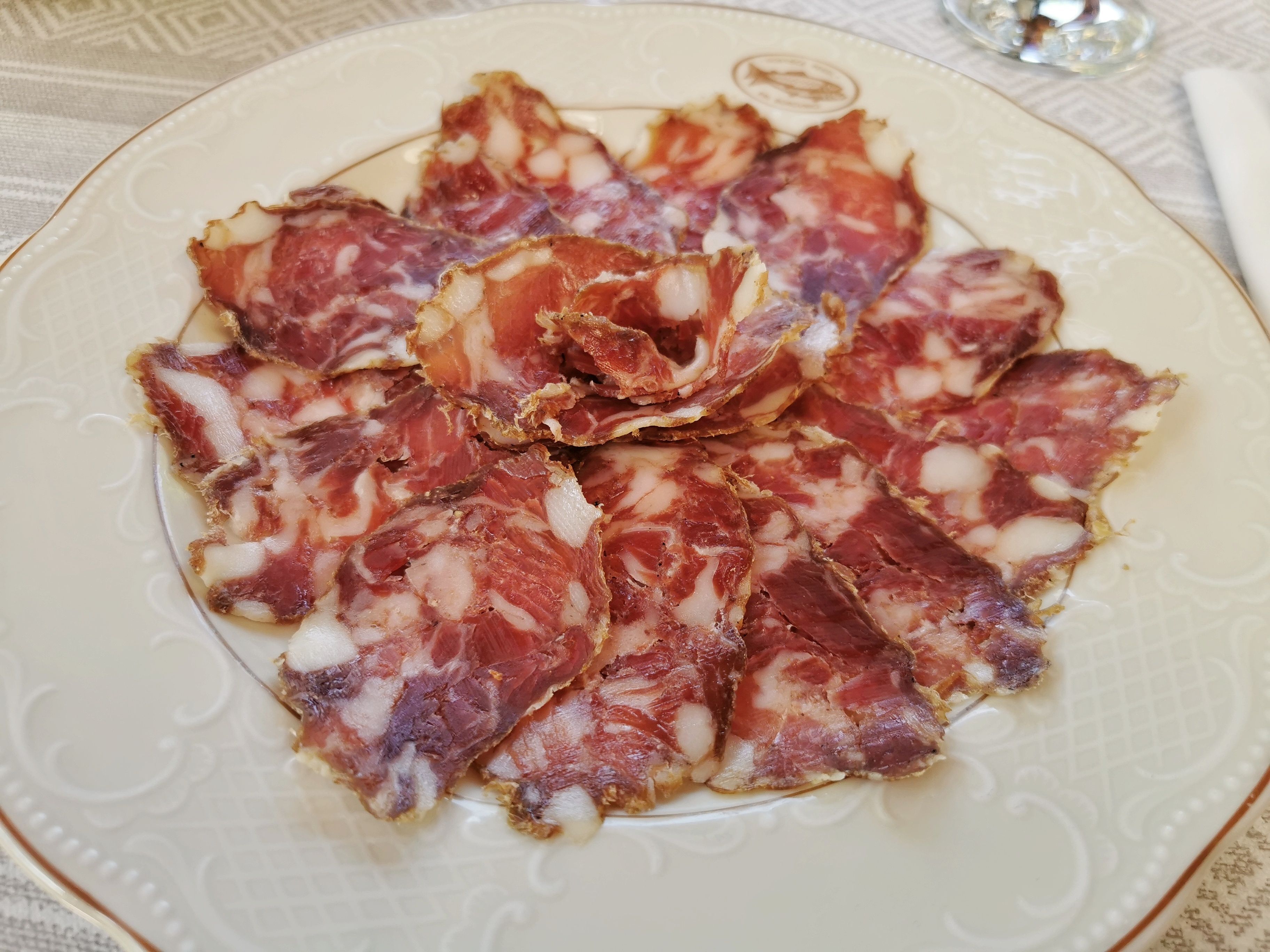 Narezek domače, rahlo dimljene suhe salame iz svinjine, ki skupaj s svežim mehkim hišnim kruhom s hrustljavo skorjo zlahka zadovolji dve osebi, stane sedem evrov. Enako ceno so postavili na enostaven karpačo inčunov, ki jih začinijo z grškim oljčnim oljem, poprom in limono. Je pa treba reči, da sta to edini hladni predjedi, ki sta na jedilnem listu.