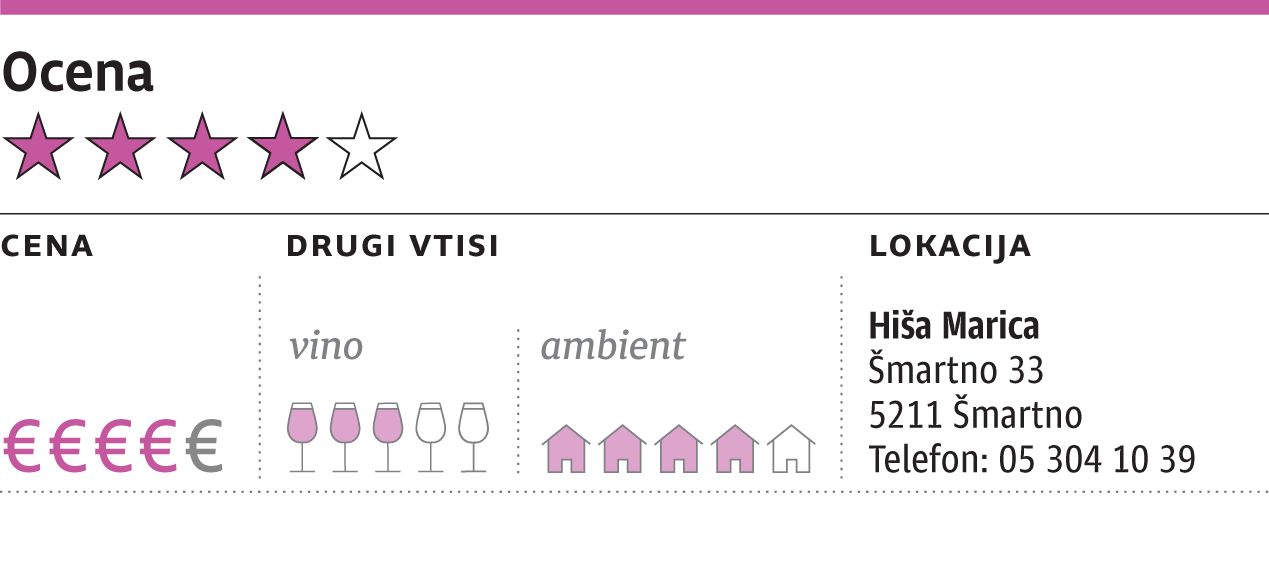 Podobne menije sicer ponuja tudi Belica v Medani, a se zdi, da njena sestra Marica v Šmartnem kuha z za odtenek bogatejšimi sestavinami. Čeprav za joto s kislim zeljem (pet evrov) to ne velja dobesedno, a jo skuhajo kot najboljšo uležano enolončnico, ki jo bogatijo koščki slanine. Tudi če ne boste pri volji za degustacijo, si, recimo za kosilo, naročite pršut, joto in kozarec vina, užitek je nezaslišan.