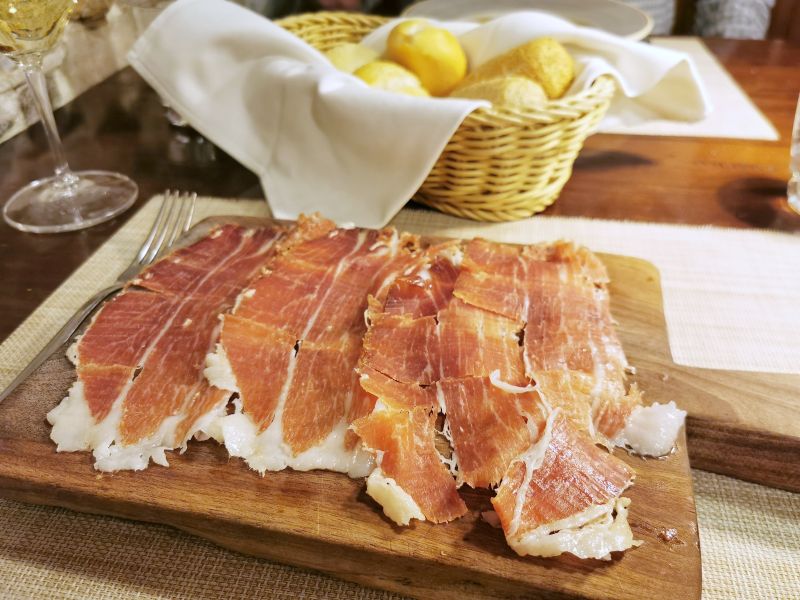 Pred glavnimi jedmi smo dobili še dve, razmeroma konkretni predjedi – domačo klobaso na pirini rižoti z belim zeljem, kremo iz kuhanega rdečega zelja in hrustkom iz polente (10 evrov), na drugi strani pa skoraj preslan popečen pršut na radiču, tokrat bolj običajnem zelenem.