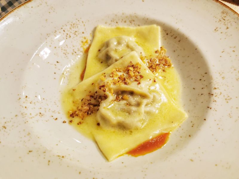 Naš duet, ki je ob koncu večerje vse bolj postajal trio, se je pri konkretnejših predjedeh zabaval z vedno učinkovitim belim de Baguerjem iz Kleti Brda. Vino se je pričakovano lepo ujelo z goriško vrtnico, sukenskim regutom ali roso di Gorizia oziroma, da bo razumljivo vsem, z zimskim solkanskim radičem. Hrustljava solata (sedem evrov) je natančno zabeljena s popečenim pršutom in okrepljena s fižolom. Na drugi strani mize so postregli raviole z melancani (deset evrov), podložene z maslom in paradižnikovo omako, da pa jed ne bi bila preveč pusta, se poigrajo s pršutom in parmezanom v obliki drobtin.