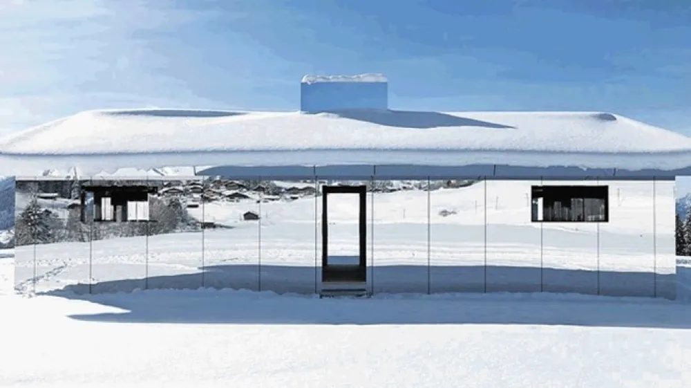 Ameriški umetnik Doug Aitken je v zasneženih gorah Gstaada v Švici postavil hišo, obloženo z zrcali. Enonadstropna zgradba, imenovana Mirage, z odsevi odraža okoliško pokrajino in izginja vanjo. Na svoji gorski lokaciji bo ostala dve leti. Hiša se spreminja glede na spreminjajočo se pokrajino v različnih letnih časih in po mnenju umetnika tako gledalca opozarja na spremembe v okolici in tudi spremembe življenj nas samih. Obiskovalci lahko prosto raziskujejo zrcalno strukturo, ki ima odprta vrata. Notranjost je tudi zrcalna, da ustvari kalejdoskopski učinek. Aitken je Mirage že leta 2017 namestil v puščavi zunaj Palm Springsa in znotraj nekdanje državne banke v Detroitu. Za vsako postavitev je optično prilagodil kote konstrukcije. mp