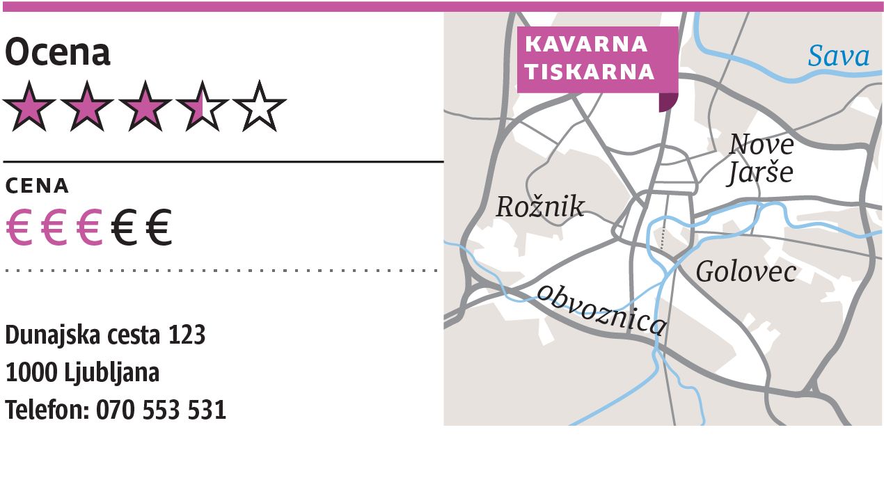 Če že ne morete jesti pod svobodnim soncem, je hrana, ki jo pripravljajo v Kavarni Tiskarna, kot naročena za spremljanje televizijskih dogodkov ali za obiske, med katerimi recimo okušate različne alkoholne pijače. Tudi ko gre za serijo hot dogov, ki jo ponujajo. Cowboy hot dog ali po naše kavbojski hot dog (okoli pet evrov), ki je (edini) prišel na naš naslov premalo topel, je bogata različica te popularne hrane: štručka, telečja hrenovka, žar in aioli omaka, popečena slanina, kisle kumare in hrustljava čebula so kombinacija, ki je ne gre prezreti, če že naročate v Tiskarni. Manj smo bili navdušeni, ko smo ugotovili, da so vse verzije pečenega krompirja, naj gre za podeželskega, hišnega ali mehiškega, pravzaprav enak konfekcijski krompirček, le začinijo jih malo drugače.