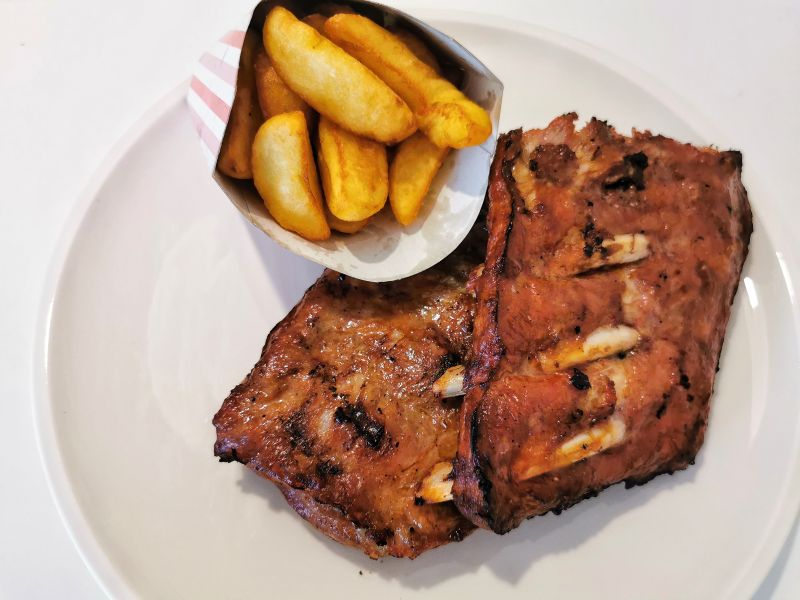 Še kanček bolj kot burgerji so nas prijetno presenetila svinjska rebrca. Porcija počasi pečenih, kot se spodobi lepljivih, rebrc je bila zajetna, mi smo jo oplemenitili s hišno omako in krompirčkom.