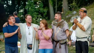 Matej Pšeničnik (prvi z desne), lastnik zemljišča z območjem arheološkega parka, je na Keltski dan praznoval rojstni dan, zato so mu čestitali in se mu zahvalili za gostoljubje. / Foto: ŠUDR