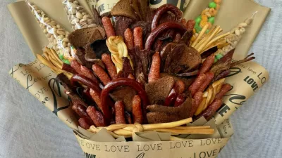»Izdelujem najbolj bizarne užitne šopke na svetu,« pravi samozavestno. Med sestavinami so piščančje krače, morske dobrote, suši in čips, v enem primeru pa celo mini burgerji z ocvrtim krompirčkom. Romantika? Odvisno od tega, kako zelo imate radi hitro hrano.