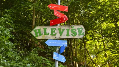 Cesto dosežemo pri majhni kapelici, ob kateri je razpotje več poti. Naša pot vodi desno, do naslednjega razpotja, kjer zavijemo levo v hrib z oznakami lovska pot. Skrbno sledimo oznakam, ki vodijo nekoliko višje mimo klopce in na greben. Čez čas pridemo do makadamske ceste, ki je zaprta za javni promet. Kočo na Hleviški planini dosežemo v dobrih petih minutah, od tam gremo v gozd in pot se začne dokaj strmo vzpenjati. Do vrha ni več daleč, od koče kakih dvajset minut.