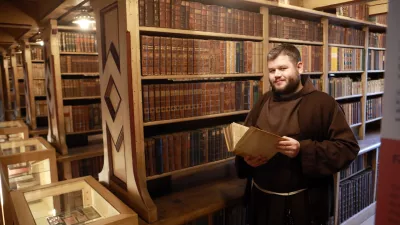 Knjižnica po več selitvah danes domuje v stavbi, ki so jo po potresu leta 1896 zgradili posebej zanjo. »Delo dunajskega cesarskega arhitekta Raymunda Jeblingerja,« je pojasnil brat frančiškan Bernardin Iljaš, ko nam je skozi železna vrata odprl pogled na knjige, zložene v treh odprtih etažah, ki dajejo knjižnici veličino in obiskovalca nehote spomnijo zgodovinski roman Ime rože pisatelja Umberta Eca.