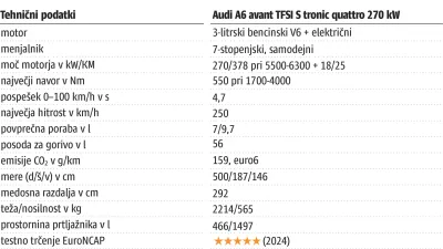 Karavanska različica A6 je seveda bolj uporabna od limuzinske. Ključna razlika pa se skriva v zadku. Dostop do prtljažnika je tako enostaven, saj za odpiranje in zapiranje zajetnih vrat skrbi elektrika. Prtljažnik je velik. V uradnih tehničnih podatkih je sicer zapisana številka 466 litrov, a nam se je zdel še precej večji, saj kovčke, potovalke in ostalo kramo golta še hitreje kot zgoraj podpisani mlečno čokolado z lešniki. Ko potrebujemo še več prostora, enostavno podremo zadnjo klop, tedaj nastane skoraj ravno dno, prostornina pa znaša zelo uporabnih 1497 litrov. Dovolj na primer, da v zadek spravite dve gorski kolesi. Da pa šestica po koncu testiranja ni dobila čiste desetice, je kriv pametni ključ oziroma njegova omejena pamet. Avto je vedno odklenil samodejno, pri zaklepanju pa je pokazal muhasto nrav in se je bilo potrebno dotakniti kljuke. Namesto zaključka zgolj še opazka, da je A6 lani na testnih trčenjih za varnost potnikov prejel maksimalnih pet zvezdic.