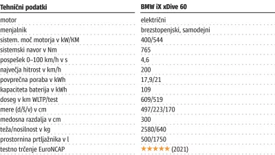 Posebna izkušnja je tudi vožnja. BMW-jevi inženirji so znani po tem, da tu celo nekoliko pretiravajo. Pri xDrive 60 imamo opravka s kar 544 konji z instantnim navorom 765 Nm. Kombinacija tega to dve toni in pol težko pošast izstreli do stotice v 4,6 sekunde. Kakšen je občutek ob takšnem manevru? Zapekle so me oči. Ko avto voziš kot civilizirano bitje, se tako obnaša tudi iX. Zgledno v ovinkih, mirno na cesti in v vseh pogledih skrbi za zadovoljstvo med vožnjo. Na nemških avtocestah pa se lahko preganjate tudi s hitrostjo do 200 km/h.