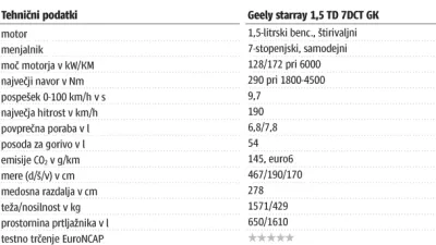 Med njimi sicer še ni bilo kitajskega predstavnika, a se zna zgoditi, da bo tako že letos. Kitajci namreč vse bolj odločno stopajo tudi na evropski in posledično slovenski trg, nič drugače pa ni z njihovo bogato, leta 1986 ustanovljeno znamko Geely, ki je postala svetovno znana, ko so kupili Volva. Testiranje starraya, njihovega srednje velikega športnega terenca, je bilo zanimiva izkušnja. Zanimiva tudi zato, ker je malce drugačen od tega, kar smo vajeni. Začnimo z drugačnostjo. Varnostni pas si morate pripeti, brez tega avta ni mogoče zagnati, kar je zagotovo pohvalno. Se morate pa na pamet naučiti frekvence vseh priljubljenih postaj. Zakaj, se verjetno sprašujete. Radijski sprejemnik (mimogrede, digitalni radio DAB ni na voljo) kaže zgolj frekvence, ne pa tudi imena postaje, kar je moteče. Pri tem pa se drugačnost ne konča. Ko namreč vzpostavite prostoročno telefoniranje (tako imenovani bluetooth), se namreč povezava vsakič, ko avto ugasnete, podre in jo je treba vzpostaviti na novo. Nekoliko nenavadna je tudi nastavitev zunanjih ogledal. Če iščete stikalo ali gumb, ga iščete zaman. Šele s pomočjo navodil smo namreč ugotovili, da lahko ogledali nastavimo s pomočjo velikega barvnega zaslona na dotik (premer je 33,5 centimetra oziroma 13,2 palca) in drsnika na volanskem obroču. Pri tem se zgodba o drugačnosti na srečo konča.Sicer je starray avto, ki preseneča z všečno obliko in dobrimi lastnostmi. Bencinski motor je zmogljiv, 172 iskrivih konjičkov pa komajda čaka, da jih poženemo v dir. 190 km/h najvišje hitrosti in 9,7 sekunde pospeška do stotice je za avto, ki brez potnikov tehta približno 1,6 tone, hvale vredno, pohvalo pa si zasluži tudi 7-stopenjski samodejni menjalnik, ki vožnjo naredi udobno in razbremeni voznika, pri čemer pa piko na i udari aktivni tempomat. Ta načeloma sam pospešuje, zavira in ohranja varnostno razdaljo, žal pa gre pri vožnji na avtocesti še korak naprej in začne vselej, ko zazna ovinek, kljub dovoljeni hitrosti 130 km/h zavirati, kar je moteče in tudi nerazumljivo, saj ovinki niso takšni (zelo zaviti), da bi jih bilo treba v prid varnosti odpeljati z nižjo hitrostjo. Glede na to, da gre za zajeten avto s pogonom na prednji kolesi in z dolžinsko mero 4,67 metra, se zdi povprečna poraba 7,8 še nekako v mejah sprejemljivega, doseg z enim polnjenjem pa je malce manj kot 700 kilometrov.