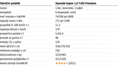 Bayon je Hyundaijev vstopni križanec, ki se po velikosti uvršča med i20 in kono. S prenovo je dobil nekoliko posodobljen zunanji videz, njegov enolitrski bencinski trivaljnik pa zadostuje potrebam. Z drugo najboljšo opremo premium ga prodajo za 24.590 evrov.