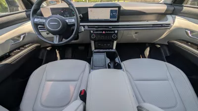 Voznikov zaslon in multimedijski zaslon sta po novem združena in lepo skrita pod enotno steklo, kar daje zelo dodelan in premijski vtis. Za večjo preglednost pa so med multimedijski zaslon in gumbe vrinili zračnike, s čimer so razbili monotonost in nepreglednost. Za povrh so gumbi lepa kombinacija vrtljivih, fizičnih in tistih na dotik, kar celotno stvar še nekoliko razgiba ter prispeva k preglednosti. Pohvale gredo tudi za odločitev, da so se odpovedali sredinski konzoli s pokrito odprtino za odlaganje stvari na višini meč. To je bilo precej nepraktično. Zgornji del konzole so spredaj odprli, zato prostor deluje veliko bolj zračno. Menjalnik so premaknili na ročico za volanom, kar je sprostilo dodaten prostor za polnilnik na konzoli. Prostor za plastenke in bidone v vratih pa je še vedno razmeroma tesen. Za tiste estetsko najobčutljivejše je podjetje spremenilo tudi volan. Tam ni več črke H v latinici, temveč so se odločili za štiri pike na srebrni ploščici, kar označuje isto črko v Morsejevi abecedi. Tudi sicer je notranjost precej posrečena in lepo sledi Hyundaijevemu minimalizmu. K prefinjeni izkušnji je pripomoglo tudi svetlo sivo usnjeno oblazinjenje, ki pa je na voljo za doplačilo.