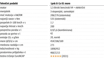 Nekaj posebnega je pogonski sklop. Z razlogom. Gre namreč za priključnega hibrida, se pravi kombinacijo bencinskega (moč 137 konjev oziroma 102 kilovatov) in električnega motorja (143 KM/107 kW). Premore sistemsko moč 276 konjev (206 kW), ki že na papirju obljublja veliko. Ali prevedeno, maksimalna hitrost je 200 km/h, pospešek do stotice pa 7,7 sekunde. Ne pozabimo, da gre za športnega terenca, za volanom katerega praviloma ne sedi adrenalinski odvisnež. Ponuja tri možnosti vožnje. Povsem na elektriko, pri čemer baterija kapacitete 17,7 kWh uresničuje približno 75 kilometrov dosega (ko zaviramo, se baterija dodatno polni), povsem na bencin, ko je poraba 6,5 litra, doseg pa 650 kilometrov ali pa kombinacijo obojega. Škoda, da posoda za gorivo sprejme zgolj 42 litrov, sicer bi bil 01 še bolj uporaben avto, saj bi se kombiniran doseg lahko približal magični tisočici, ki na primer krasi dizelsko gnane avtomobile. Njegova dolžinska mera je 4,54 metra, kar pomeni, da ga boste obkrožili še hitreje kot blejski otok, da je lahko namenjen tudi štirim potnikom, pa najprej sporoča zadnja klop, na kateri so centimetri za glavo in kolena razkošno odmerjeni, je pa tudi prtljažnik z osnovnimi 466 litri vreden svojega imena. Za nameček premorejo sicer zajetna prtljažna vrata pomoč elektrike, prtljažnik pa ima dvojno dno, tako da lahko v spodnji del zložimo polnilni kabel.