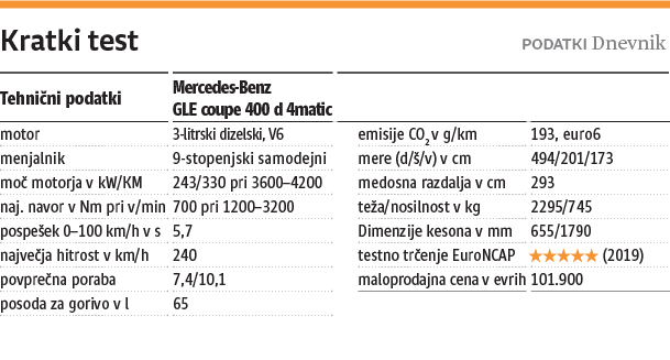 A ko smo sedli za volanski obroč mercedesa, njihovega športnega terenca, ki sliši na ime GLE coupe, smo bili malo šokirani ob pogledu na cenik, na katerem je bila izpisana evrska številka 101.900, z dodatno opremo 135 tisočakov. Je to preveč, ravno prav ali premalo? Glede na odzive drugih prometnih udeležencev, ki so se do nas vedli spoštljivo, med vožnjo smo bili deležni nevoščljivih pogledov, ko smo ga parkirali, pa številnih vprašanj mimoidočih, smo vedeli, da je nekaj posebnega. Predvsem pa štirikolesnik, ki bi ga v svojo garažo zapeljalo več Slovencev, kot ga lahko v resničnem življenju.