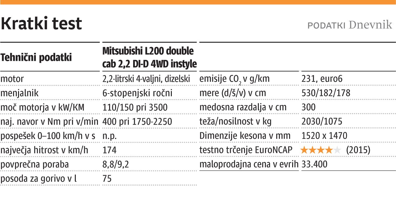Tam se je večina drugih poltovornjakov, ki smo jih preizkusili zadnja leta, pač izkazala za bolj »civilizirane«. Ko enkrat sicer z L200 vozite s stalno hitrostjo na avtocesti, je povsem dovolj udoben in miren, tudi preglasen še zdaleč ni, 110 kilovatov oziroma 150 konjev v 2,2-litrskem dizelskem motorju pa mu zagotavlja mirnost in odzivnost tudi pri hitrostih malce nad omejitvami (največ zmore do 174 km/h). Druga pesem pa je, ko ste z L200 udeleženi v vožnji ustavljanj in speljevanj, na mestnih in zavitih podeželskih cestah. Tam pride to, da gre za poltovornjak, močno do izraza, pri speljevanju je dokaj glasen, na mestu pa njegov motor kar malce neprijetno »brbota«, da se denimo ročica 6-stopenjskega ročnega menjalnika, ki ima precej dolge hode, kar malce preveč trese in premika. Se je pa pri vožnji, pri čemer je treba seveda upoštevati, za kako mogočen avto gre, L200 izkazal za ne preveč potratnega – od tovarniško izmerjene porabe po ciklu WLTP (8,8 litra plinskega olja na 100 kilometrov) je naša odstopala manj kot pol litra (9,2).