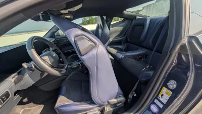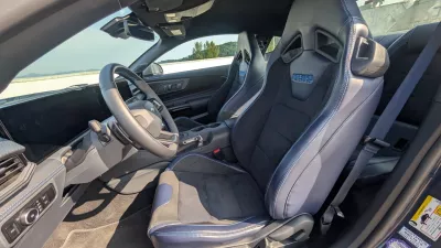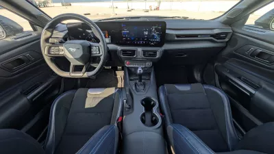 Ta psihološki učinek pomaga tudi spregledati dokaj krotek dizajn notranjosti, ki je kljub nekaterim prefinjenim potezam, kot je združitev voznikovega zaslona in multimedijske tablice pod enotno steklo, zelo proletarska. Še najbolj spominja na tiste delavske mobilnike, ojačane, da zdržijo tudi kakšen padec na gradbišču. Recarovi sedeži, ki jih je treba doplačati s 1800 evri, so bili zelo udobni in so voznika lepo prijeli tudi med živahnejšo vožnjo po ovinkih. Je pa zadnji plati znalo postati nekoliko toplo. Da so oblečeni v kombinacijo usnja in blaga, hkrati razkriva, da se je mustange zgodovinsko povezovalo zlasti z ameriškimi proletarci, ki so vseeno vajeni neke druge stopnje udobja.