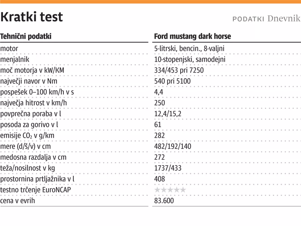 Vendar s tem je treba živeti. Mustang dark horse ni avto za vsak dan. Je avto za sladokusce, ki znajo ceniti mesene užitke vožnje. Tak avto bi našel kupce, tudi če bi se sanje o avtonomnih vozilih nekoč uresničile. So pa cene takšnega veselja v zadnjih desetletjih že presegle žepe likov iz pesmi Brucea Springsteena. Za osnovno različico s samodejnim menjalnikom je treba odšteti 83.600 evrov, za osnovno različico ročnega mustanga GT pa 68.700 evrov.