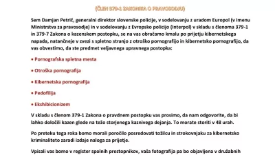 Poglejmo si vsebino aktualne različice izsiljevalskih elektronskih sporočil. Policija prejemnika obvešča, da je v »upravnem postopku«, ker da so na njegovem računalniku odkrili različne oblike pornografije, pedofilije in eksibicionizma. Pošiljatelj – v konkretnem primeru je podpisan kar vršilec dolžnosti generalnega direktorja policije Petrič – zahteva, da v roku 48 ur odpišete na navedeni elektronski gmail naslov, ki ga, seveda, slovenska policija ne uporablja, »da bo vam lahko določili kazen glede na težo storjenega kaznivega dejanja«. V nasprotnem primeru prejemniku sporočila grozi aretacija, primer bi prevzel (lažni) tožilec in (lažni) strokovnjak za kibernetsko kriminaliteto …