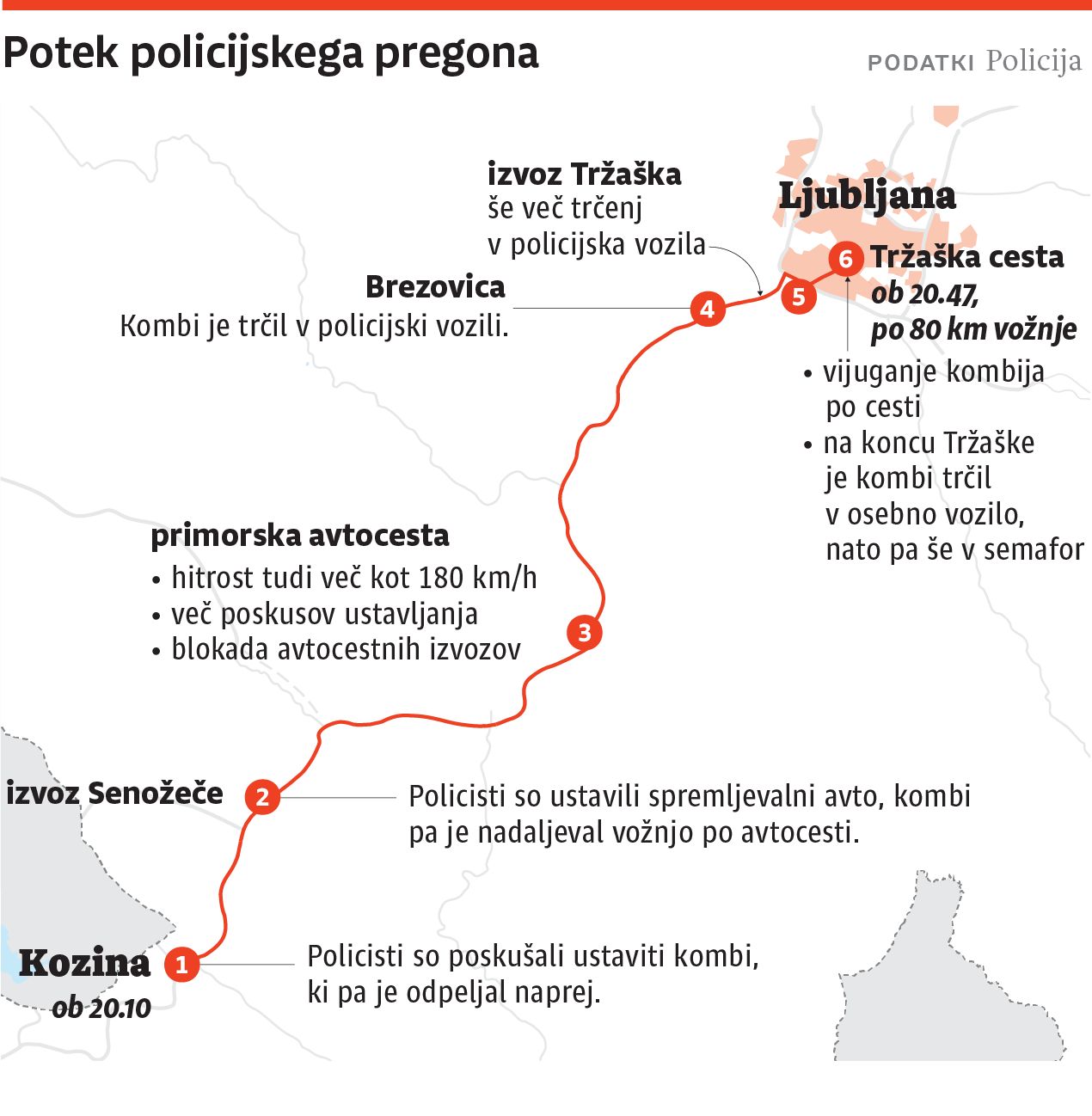 »Voznik je vseskozi vozil nevarno in z visoko hitrostjo, tudi več kot 180 kilometrov na uro,« so pregon opisali na policiji. Pri Brezovici je voznik kombija trčil v službeni vozili policije, a ga tudi to ni ustavilo, med vožnjo do izvoza na Tržaško cesto je vanju trčil še večkrat. Ustavitev je bila neuspešna. Z obvoznice je nato zapeljal na Tržaško cesto proti središču Ljubljane, kjer je s cikcak vožnjo oziroma manevri levo in desno policiji preprečil, da bi ga prehitela. Ustavil se je šele v križišču na koncu Tržaške ceste, kjer je trčil v avto, ki je stal pri rdeči luči na semaforju. Po trčenju je kombi odbilo levo in je čelno trčil v drog semaforja.