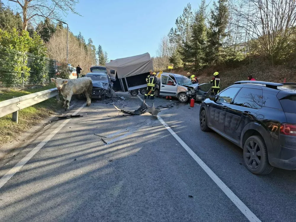 Voznik in sopotnik v avtomobilu, ki je pripeljal nasproti, se nista poškodovala, živ pa je ostal tudi teliček, ki se je peljal v prikolici avtomobila.