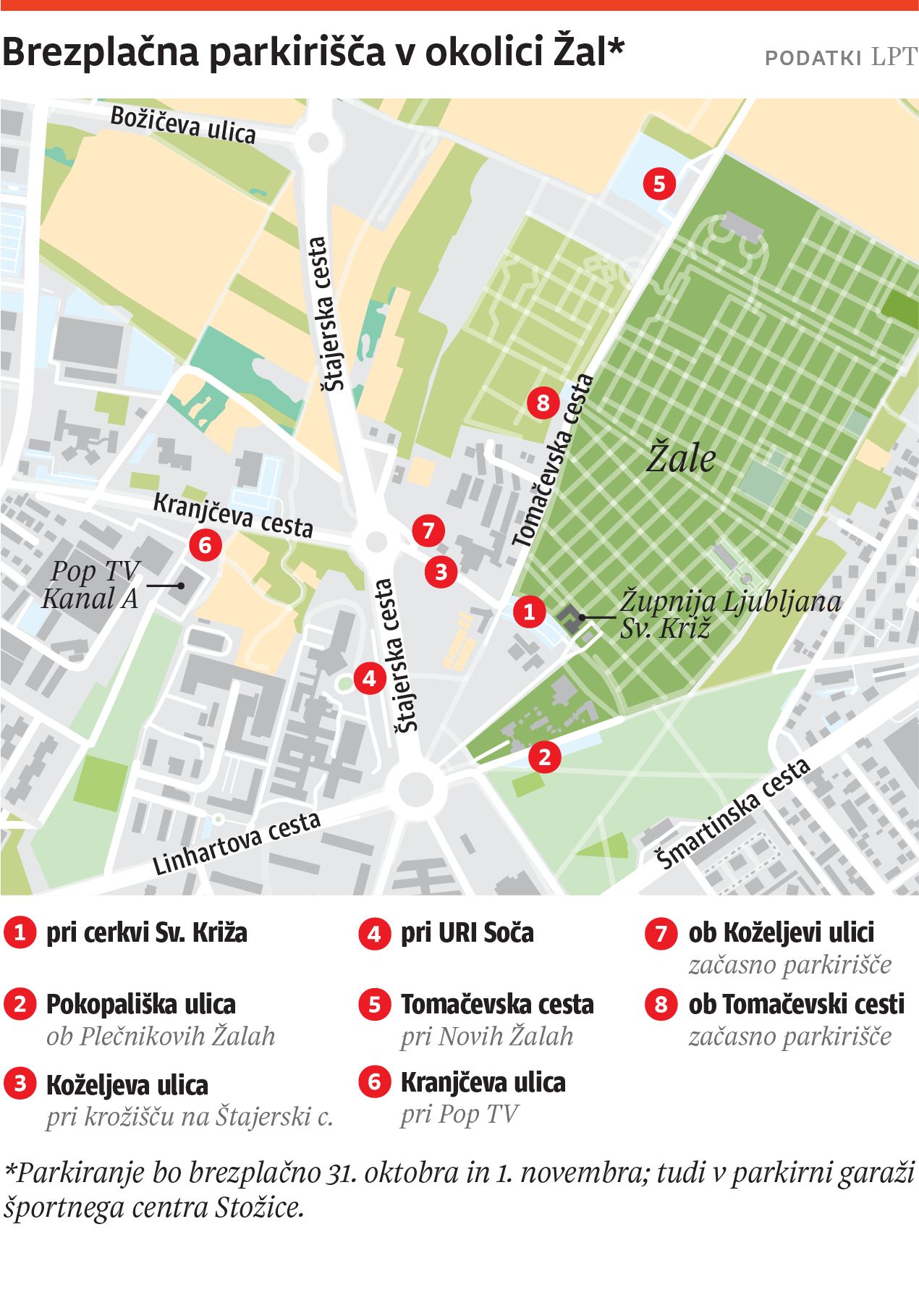 Tisti, ki se bodo na Žale vseeno pripeljali z lastnimi avtomobili, bodo slednje lahko brezplačno parkirali na osmih parkiriščih v okolici. Poleg vseh teh parkirišč bo danes in jutri parkiranje brezplačno tudi v garažni hiši športnega centra Stožice. Na javnem podjetju Žale so opozorili, da parkiranje na Tomačevski cesti ne bo mogoče, saj bo tudi letos ves čas prevozna v obe smeri. »Voznike prosimo, naj parkirajo le na za to urejenih površinah in naj upoštevajo prometno signalizacijo ter navodila redarjev,« so sporočili z Žal.