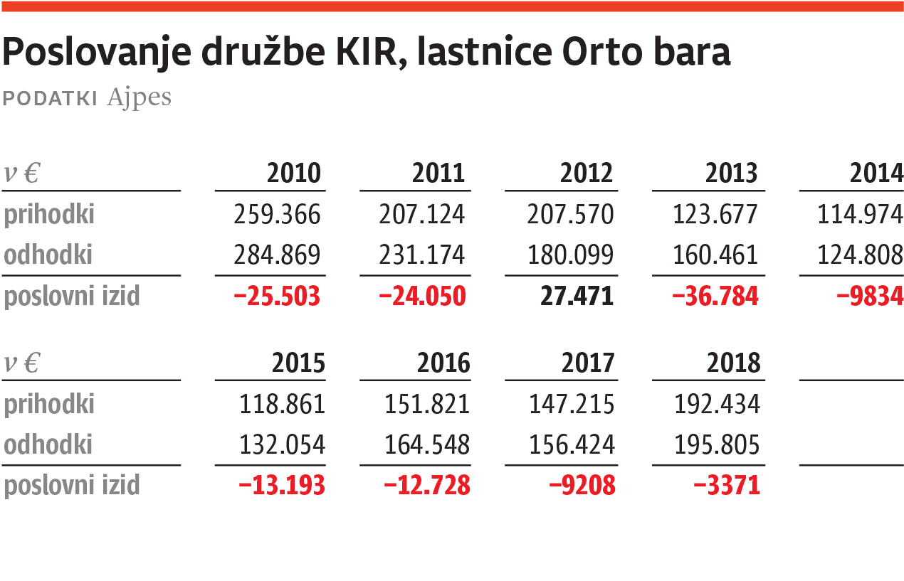 Čeprav Prihoda pravi, da odločitev o prodaji Orto bara ni povezana s poslovanjem, so bilance podjetja KIR, ki ima v lasti lokal, neusmiljene. Družba je imela od leta 2009 z izjemo leta 2012 izgubo, nabralo se je je že za več kot 100.000 evrov. Lani so dolgovi že za več kot 50.000 evrov presegli sredstva podjetja, v katerih je nepremičnina na Grablovičevi ulici 1 očitno precej podvrednotena. Zelo verjetno je to povezano z dejstvom, da etažna lastnina te stavbe ni razdeljena, tako da je na posameznih delih stavbe vpisanih kar 13 pravnih oseb. Poleg tega je nepremičnina obremenjena s hipotekami.