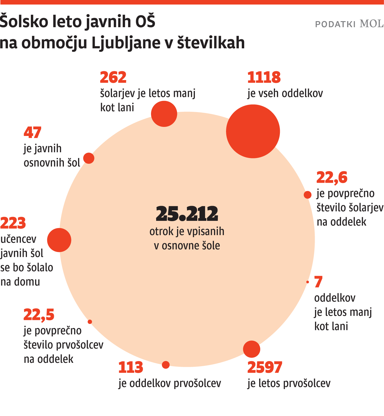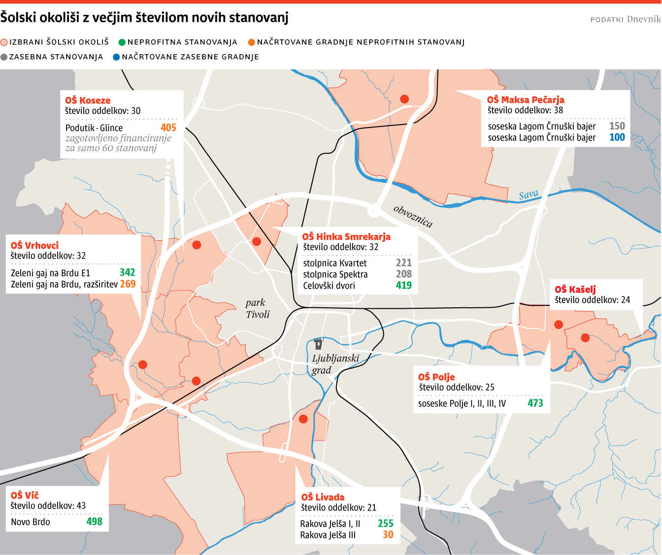 Kljub prostorski stiski v določenih šolah na občini ugotavljajo, da je letos v šolah na splošno manj otrok kot lani, ko je bilo sicer rekordno leto po številu vpisanih šolarjev. Iz tega sledi, da je v Ljubljani dovolj fizičnega prostora za vse šoloobvezne otroke. Težava je v razporeditvi, saj je očitno v določenih delih mesta več demografskega prirastka kot v drugih. Zakon o šolstvu pa občine zavezuje, da se otrokom omogoči šolanje v okolišu, kjer imajo prijavljeno prebivališče. Vprašanje je, ali nas čaka podobna zgodba tudi v drugih soseskah, kjer se gradi večje stanovanjske komplekse.