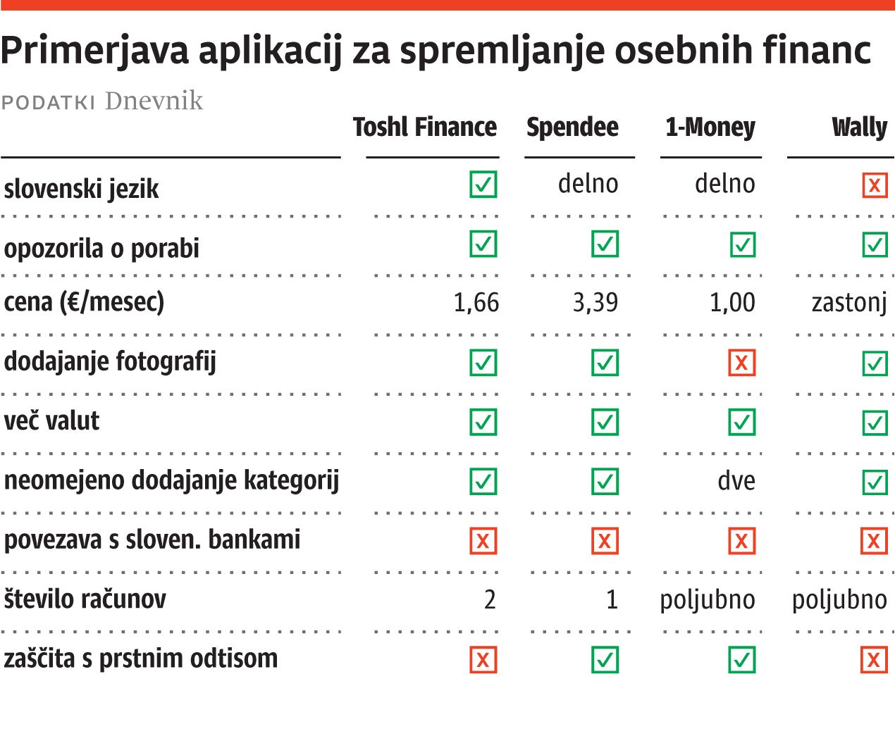Skoraj vse ponujajo možnost povezave s kopico bank, a žal z nobeno slovensko, kar v praksi pomeni, da boste morali vse transakcije vnašati ročno. To vzame nekaj več časa, a kljub temu ne več kot nekaj minut na dan. Razen ene aplikacije, ki je povsem brezplačna, vse druge ponujajo brezplačno okrnjeno različico, ki pa je lahko povsem dovolj. Osredotočili smo se zgolj na brezplačne različice aplikacij in skušali najti najboljšo. Več v tabeli na dnu.