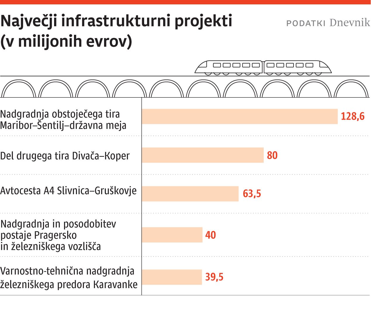 Med petimi največjimi infrastrukturnimi projekti, sofinanciranimi iz evropske sheme 2014–2020, katere črpanje se zaključuje konec letošnjega leta, so štiri naložbe v železniško infrastrukturo in ena v cestno. »Pri železniški infrastrukturi gre za drage projekte, a ne smemo gledati preozko, pač pa moramo upoštevati, da je pri teh projektih poskrbljeno tudi za precej cestne infrastrukture, kot so podvozi in nadvozi, protihrupne ograje in podobno,« pravi minister za kohezijo Aleksander Jevšek.