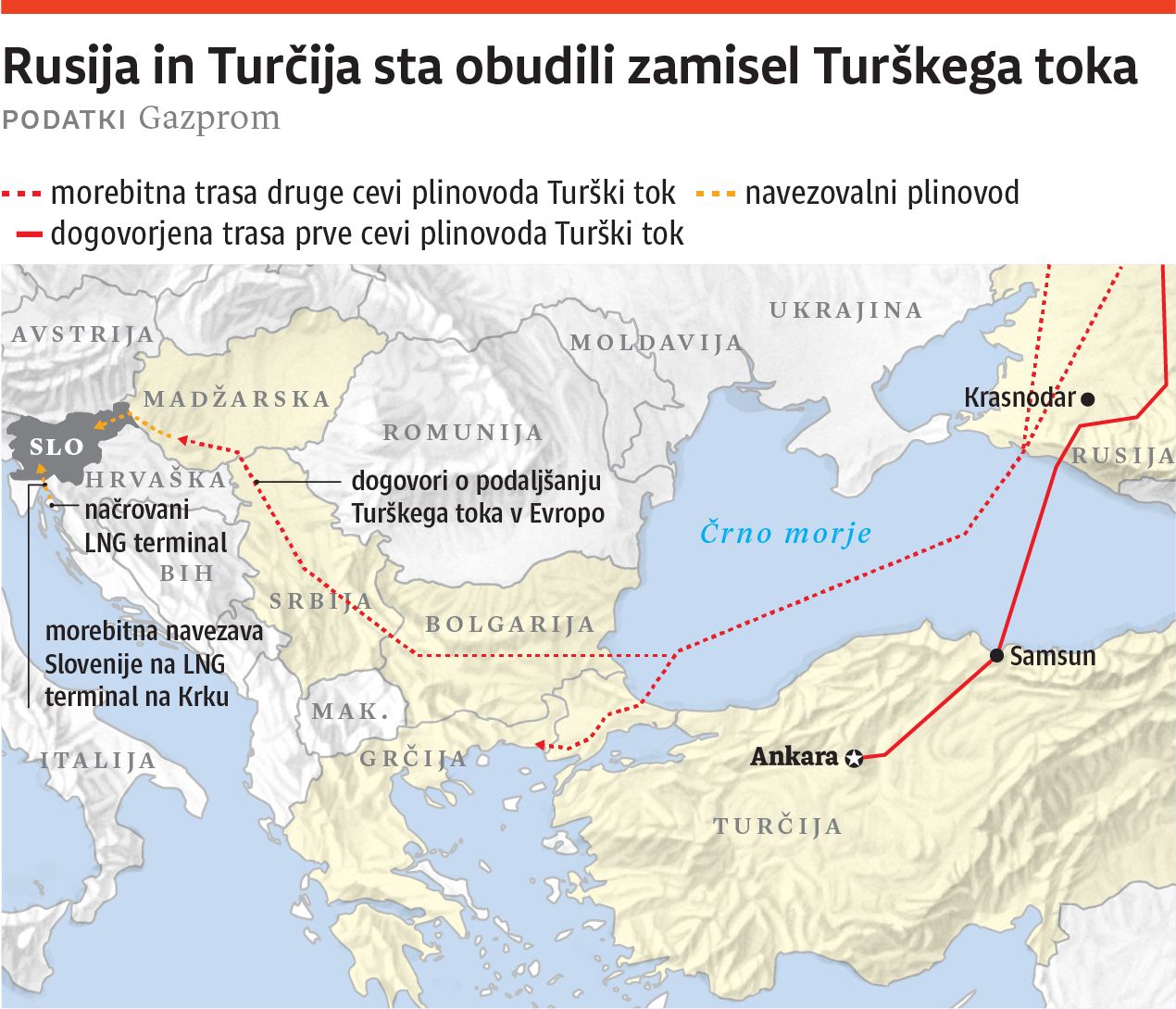 Nakazujoča se trasa druge cevi Turškega toka dejansko predstavlja obnovitev poteka plinovoda Južni tok, ki je nameraval potekati tudi skozi Slovenijo. Ali bo tudi tokrat plinovod potekal skozi slovensko ozemlje, še ni jasno. »V primeru, da bi se trasa Južnega toka revitalizirala, medvladni sporazum z Rusko federacijo še vedno velja,« pravijo na ministrstvu za infrastrukturo. Precej bolj jasni so v Plinovodih. Z ruskimi predstavniki so že izmenjali poglede na razvoj takšnega projekta, vendar opozarjajo na dejavnike, pod katerimi bi se mu lahko pridružili.