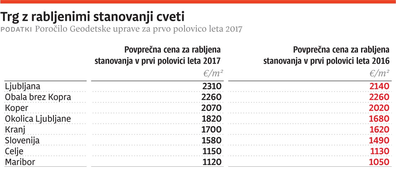 V Ljubljani se je povprečna cena rabljenega stanovanja v primerjavi z drugim polletjem lani zvišala za 4,5 odstotka in je z 2310 evri za kvadratni meter prvič od začetka spremljanja cen prehitela območje Obale brez Kopra. Tam je cena rabljenih stanovanj ostala enaka kot v drugem polletju lani, torej pri 2260 evrih za kvadratni meter. V Kopru se je povprečna cena rabljenega stanovanja zvišala za 9 odstotkov, na 2070 evrov, v okolici Ljubljane za 3,4 odstotka, na 1820 evrov, v Kranju za 5,6 odstotka, na 1700 evrov, v Celju za 0,9 odstotka, na 1150 evrov, in v Mariboru za 1,8 odstotka, na 1120 evrov.