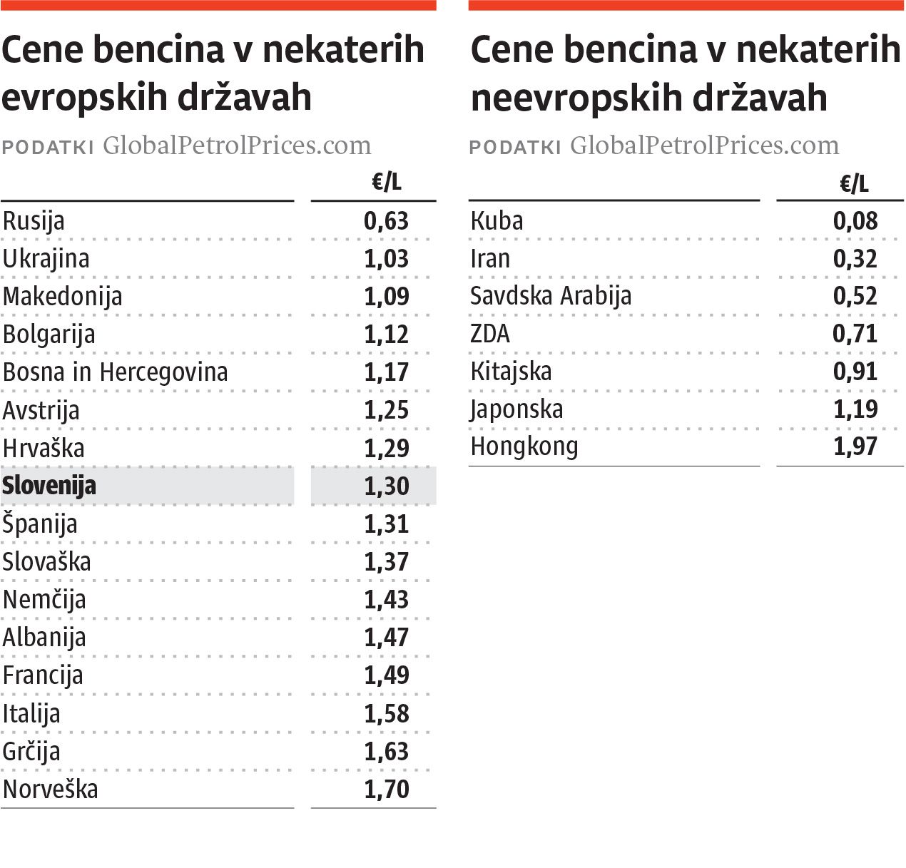 Kot v večini evropskih držav so se v zadnjem tednu tudi v Sloveniji cene bencina in dizla znižale. Polnjenje 50-litrskega bencinskega rezervoarja se je v torek pri nas pocenilo za 1,45 evra. Slovenija se sicer po ceni bencina in dizla med evropskimi državami uvršča nekje v sredino. Najmanj potrošnik za liter bencina odšteje v Rusiji, in sicer 0,63 evra. V Makedoniji in Bolgariji, ki sodita med deset najcenejših evropskih držav, cena znaša že 1,09 oziroma 1,12 evra za liter. V Bosni in Hercegovini je treba za liter plačati 1,17, v Avstriji 1,25 evra. Če je imela še v začetku avgusta Hrvaška malenkost dražji bencin kot Slovenija, je zdaj našo državo na lestvici prehitela z 1,29 evra za liter. V Nemčiji stane liter 1,41 evra, v Franciji 1,50 evra, v Italiji že 1,59 evra. V Grčiji je treba za liter bencina odšteti celo 1,63 evra, na Norveškem, čeprav je proizvajalka nafte, pa največ, 1,72 evra.